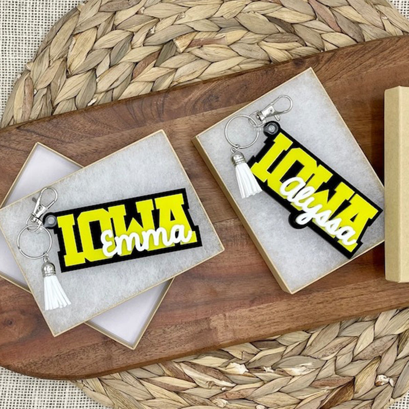 T H A N K ∙ Y O U! This custom, personalized, acrylic college + name tag keychain / bag charm is perfect for grads, college students or anyone! Use them for dorm keys, dorm decor, house keys, car keys, purse charms or backpack charms. They are made with 3 layers of acrylic - indicate (1.) the bottom & (2.) middle layer colors plus the (3.) middle layer school letters and (4.) top layer name in the personalization box. Top layer names are made in the font shown, maximum 7 letters, and will be in white (recommended) unless otherwise specified. The middle layer school letters will be in varsity block font unless otherwise specified as "bubble font". 😊 This makes the perfect college acceptance and high school or college graduation gift!