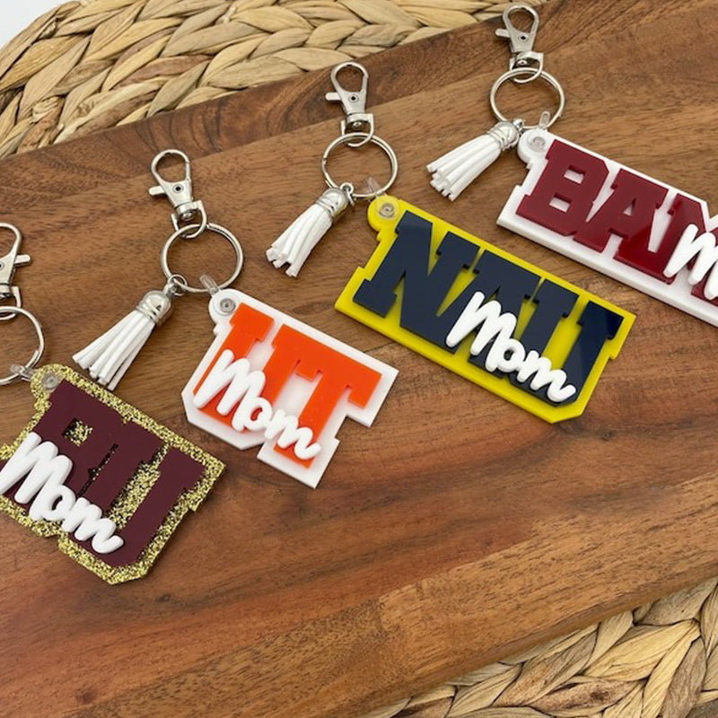 **Includes a keychain and a mini leather tassel chosen in a complimentary color. Keychains are approximately 1.8" tall and range from ~2-4" long. Acrylic colors and font choices are in the photos.