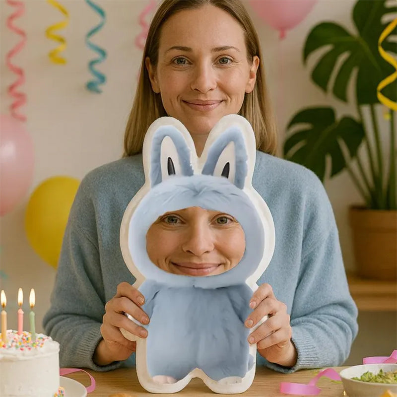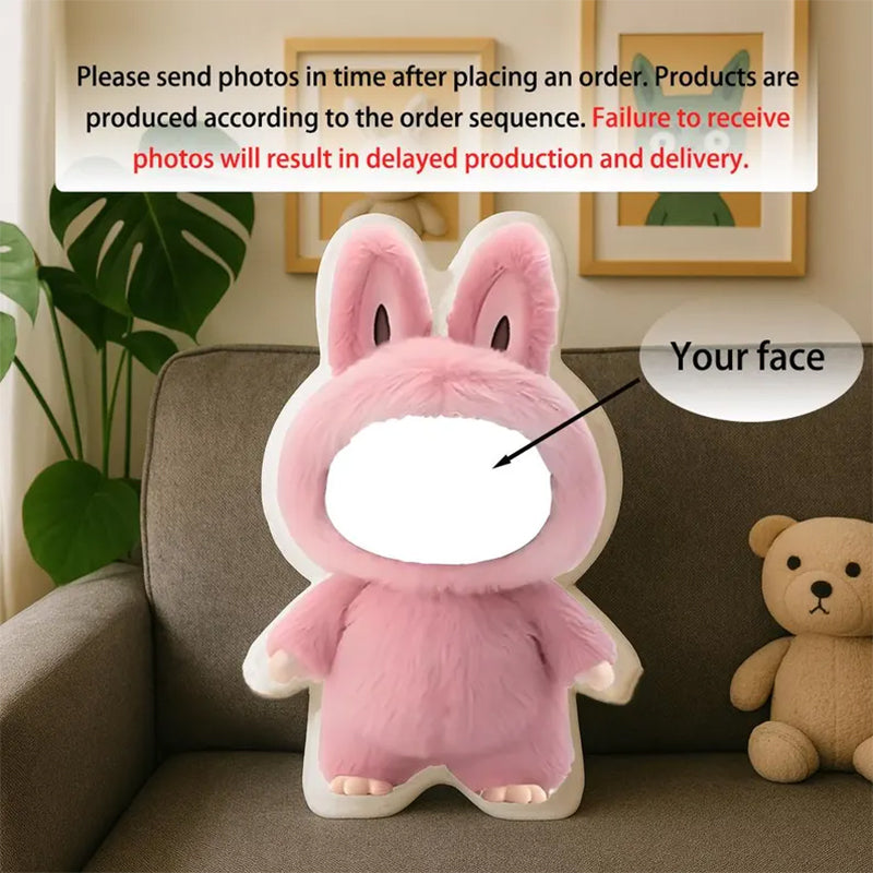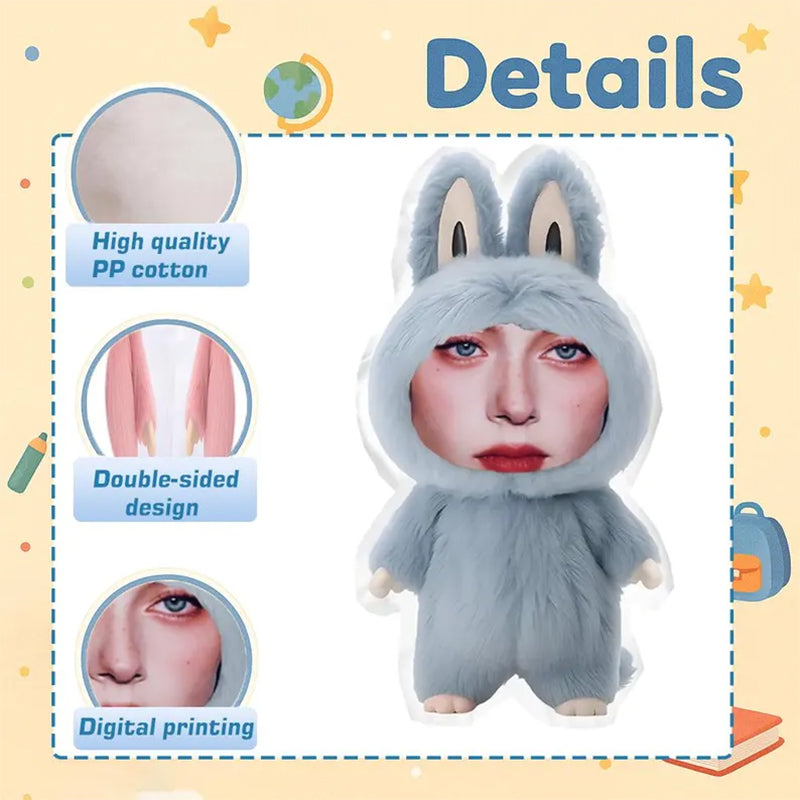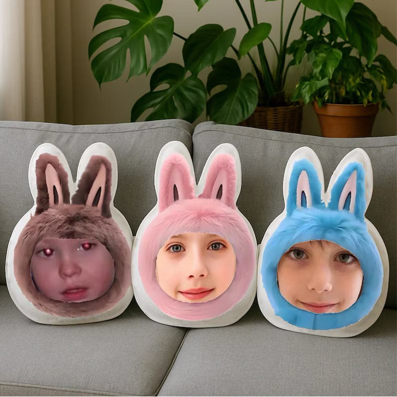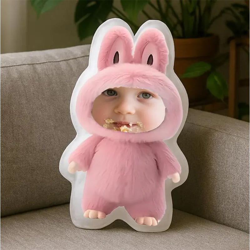 Looking for a fun, personalized gift? Our custom face pillow transforms your photo into a soft, cozy pillow shaped like an adorable Labubu bunny face.