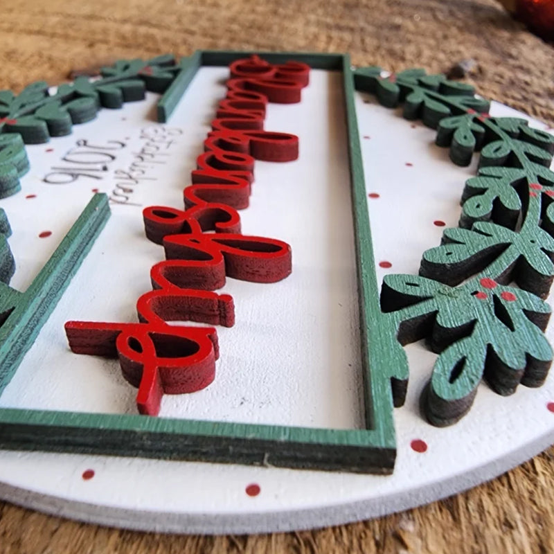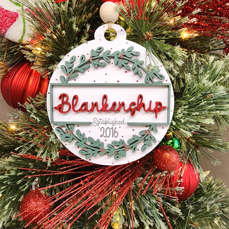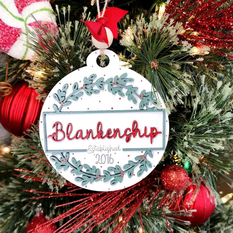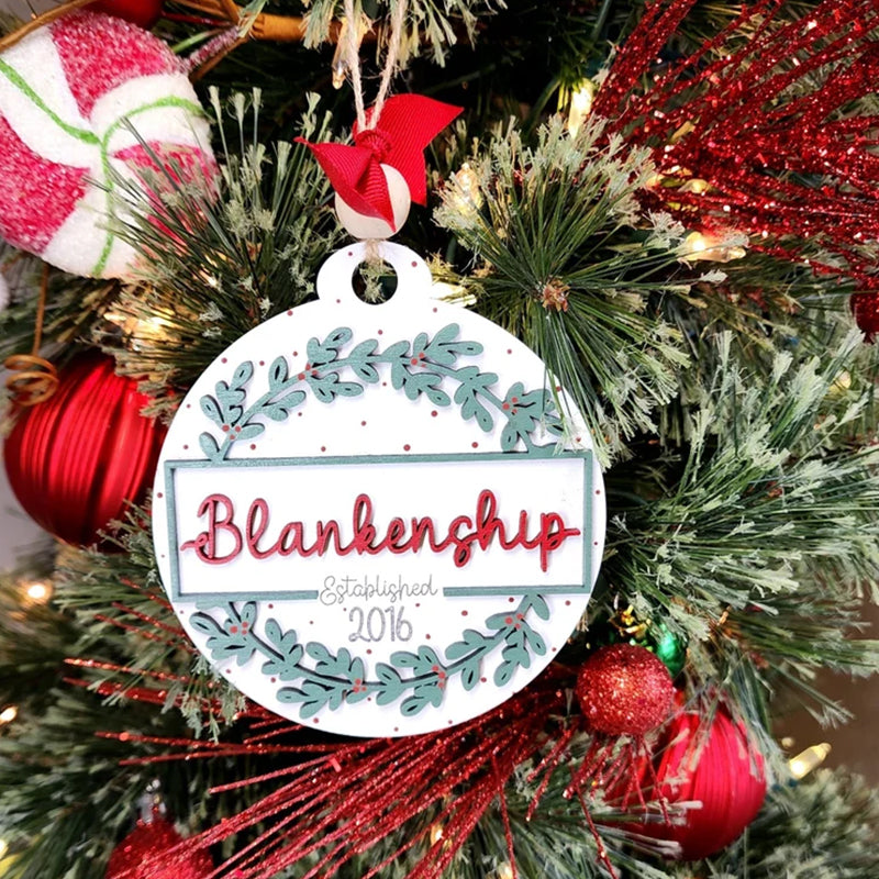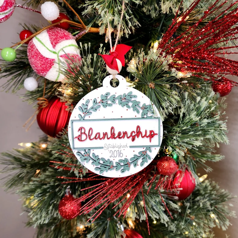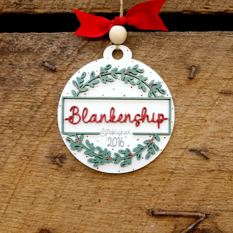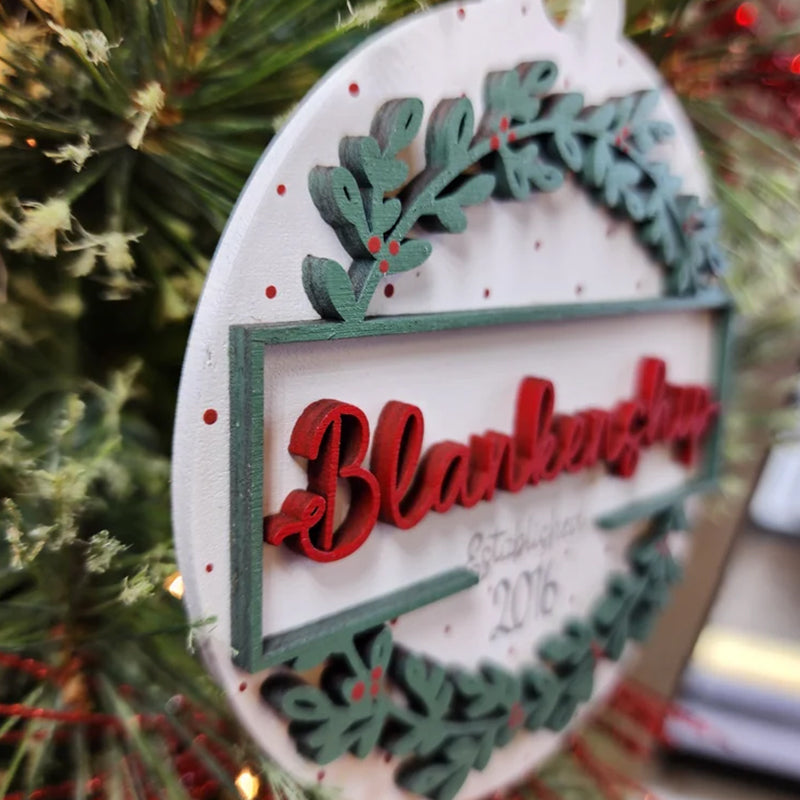 This ornament measures 4" wide. It is a layered ornament cut from quality birch. The base layer has the "established" and year engraved into the wood. The top layer and the name are cut from wood and added to it. The ornament is hand painted and is accessorized with a ribbon and twine for hanging.