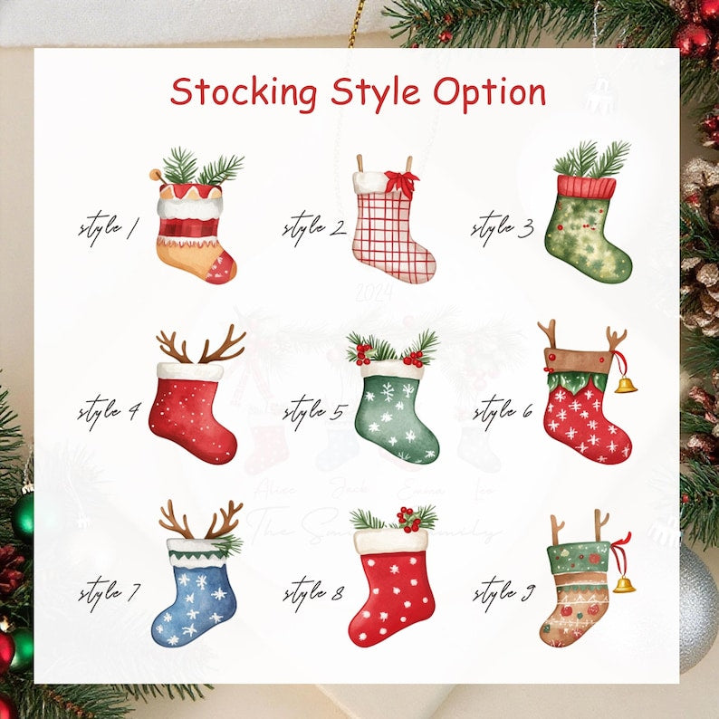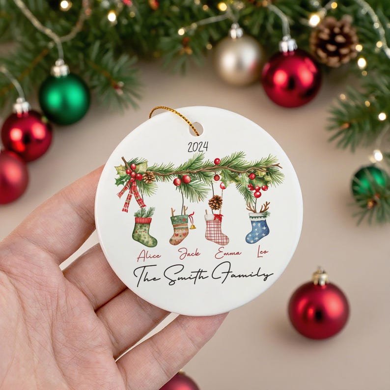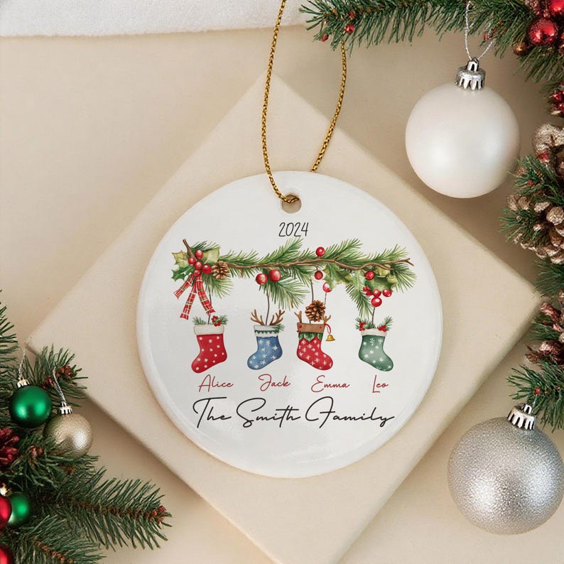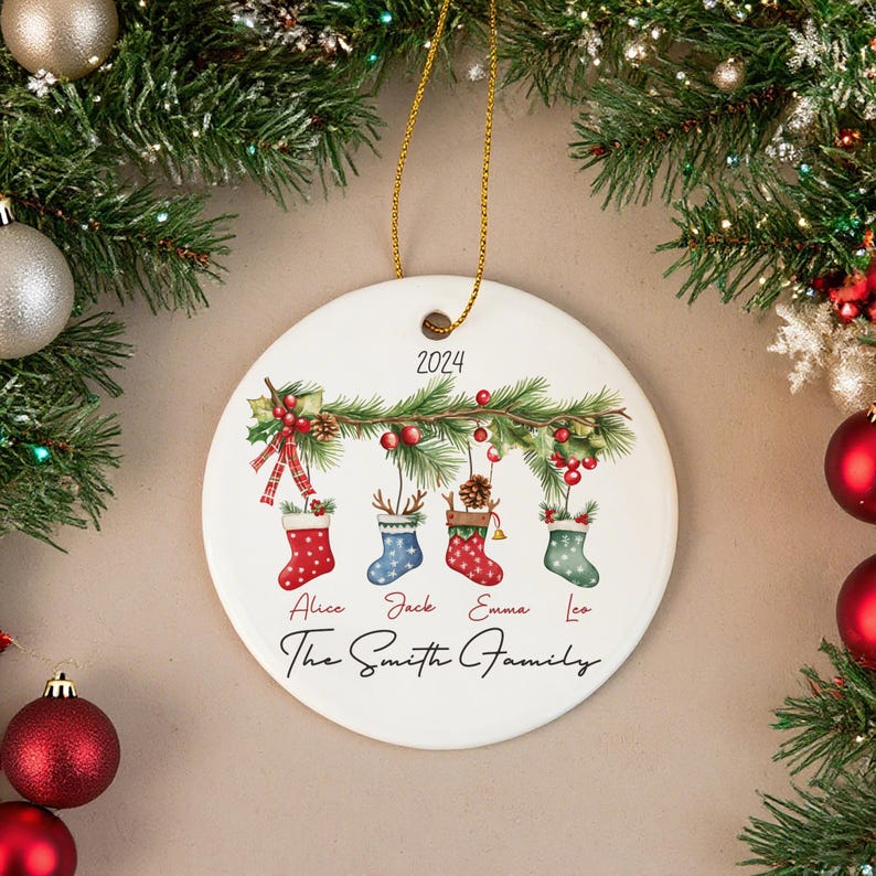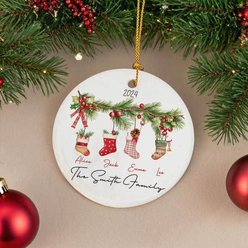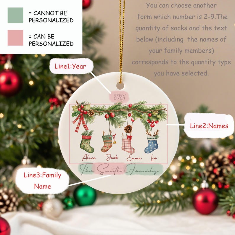 Celebrate your family Christmas with our personalized decoration. This exquisite piece features a beautifully designed circular ornament adorned with charming Christmas stockings—each decorated with festive patterns such as hearts, checks, reindeer, and Christmas trees in bright red and green hues. The top of the ornament is embellished with green leaves, red berries, and a red bow, adding to its festive charm.Each stocking on the ornament is marked with the name of a family member, creating an eternal souvenir to commemorate the first Christmas your family spent together.