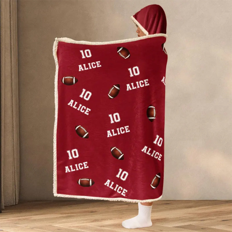 This personalized wearable blanket hoodie is the perfect gift for any American football player or team member. Designed for ultimate comfort and warmth, it combines the cozy feeling of a blanket with the convenience of a hoodie, making it ideal for chilly game days, practice sessions, or relaxation after a tough workout. Customized with their name, team number, this blanket hoodie offers a personal touch that celebrates their love for the game.