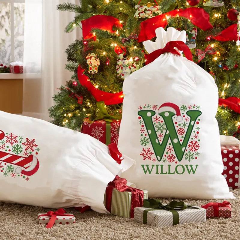 UNIQUELY PERSONALIZED: Presents, presents and more presents! Customize your oversized gift bag with any initial and name up to 12 characters—choose red name/green initial or green name/red initial design.