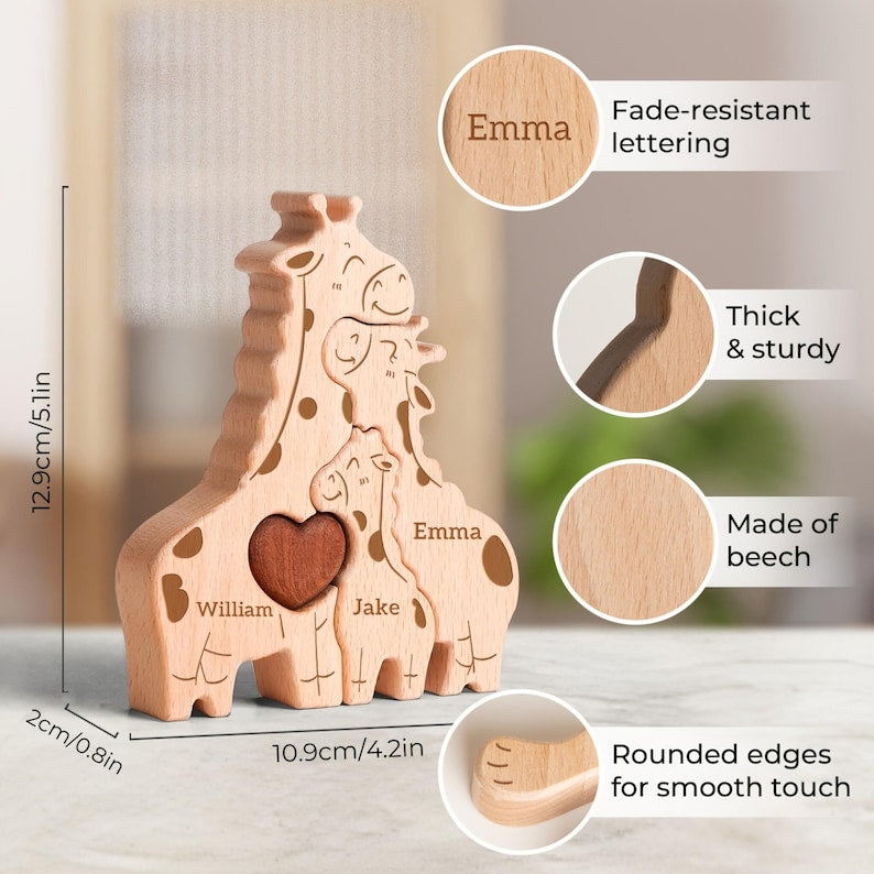 Celebrate the love of family with our handcrafted Giraffe family puzzle. This sweet wooden puzzle features a family of four giraffes, symbolising togetherness and love. It makes a thoughtful Christmas present, Mother’s Day gift, or a special keepsake for your wife, mum, or children. Each piece is carefully crafted and can be personalised, making it a meaningful gift to treasure for years to come.