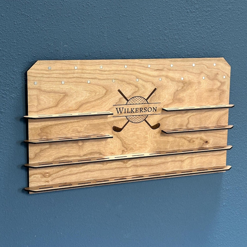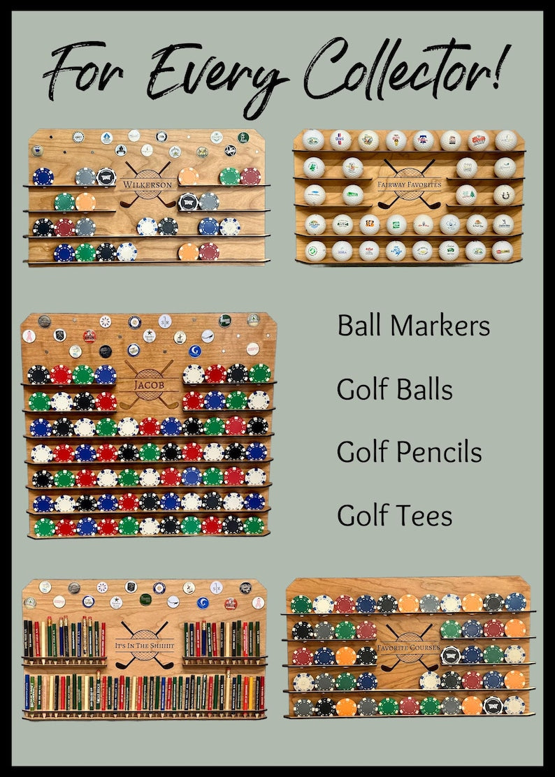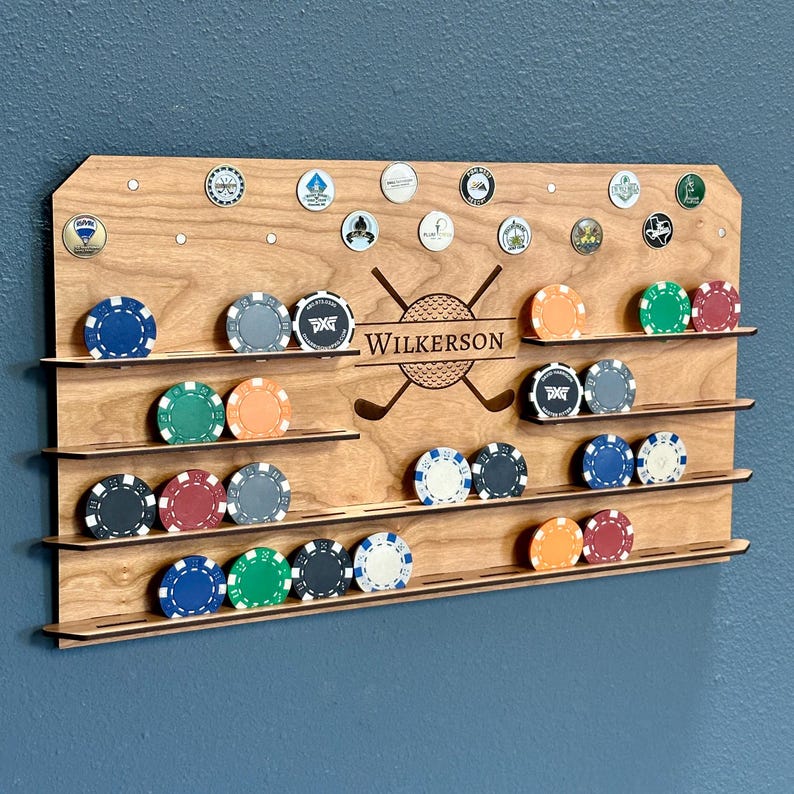 This Personalized wall-mounted display holds both magnetic and poker chip style ball markers. It comes with hanging hardware already in place so that you can display it straight out of the box. I have four other variations to accommodate what people collect so check out my other versions linked below.
