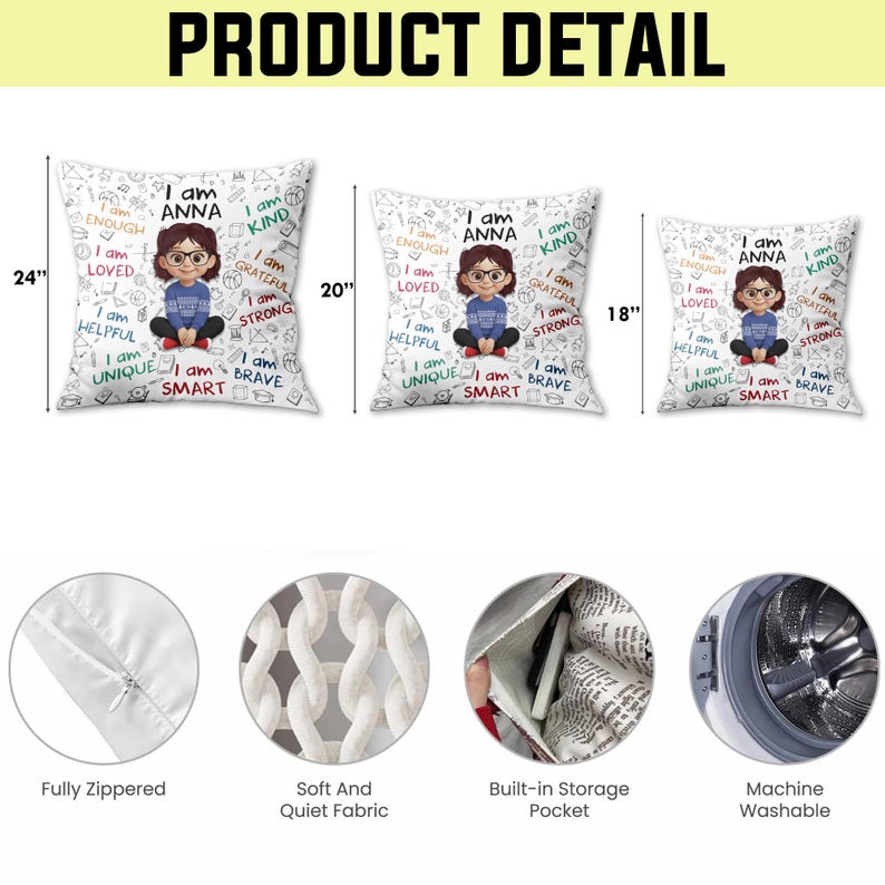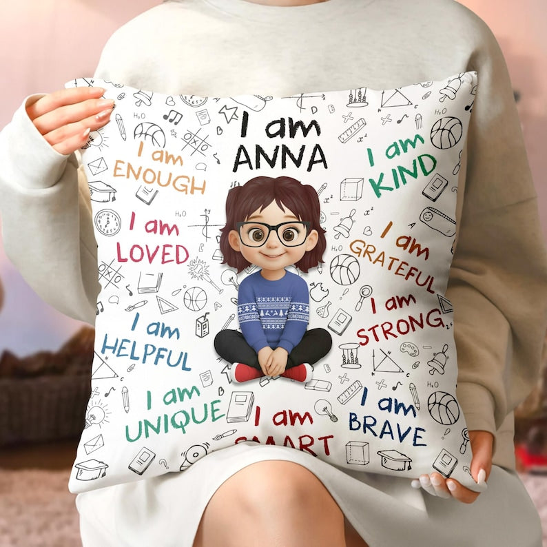 Personalized “I Am” Affirmation Pillow for Kids — custom name, self-love & confidence gift for boys and girls, perfect for bedroom or classroom decor.