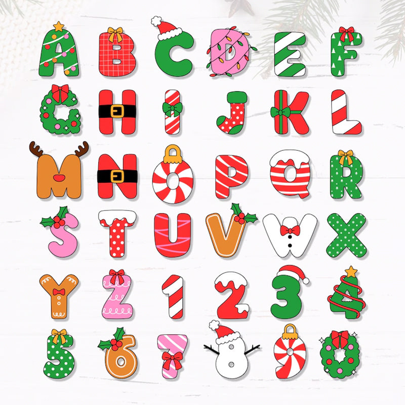 Gingerbread-inspired alphabet ornament letters with playful dots and holiday colors