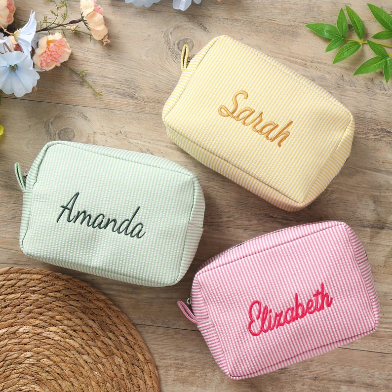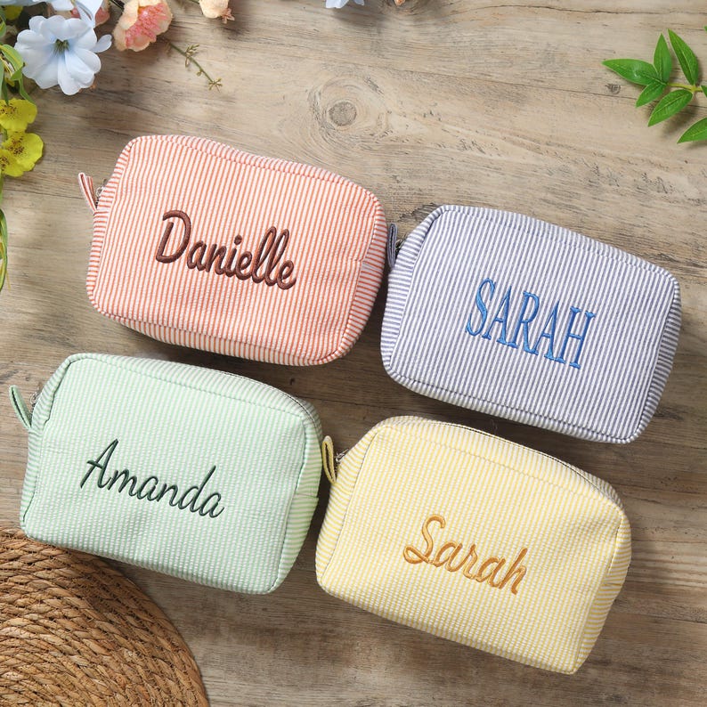 Versatile & Functional: This multifunctional seersucker makeup bag is perfect for a variety of uses. Whether you need it for travel, outdoor storage, or organizing your everyday items, it’s a great choice. It also makes an ideal gift for bridesmaids, a baby shower, birthdays, or even as a thoughtful bridal gift. With its charming pastel stripes and custom monogram embroidery, this stylish toiletry bag blends both fashion and function. It’s the perfect way to store cosmetics or travel essentials and makes an unforgettable bridal shower gift or a sweet surprise for Mother's Day. Treat yourself or a loved one to a little luxury with our embroidered makeup bag—adding a personal touch to your beauty routine every day!