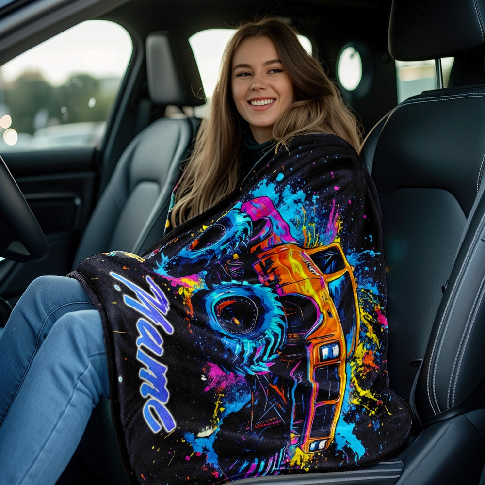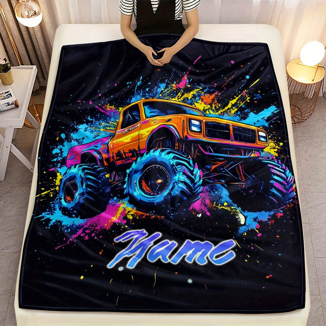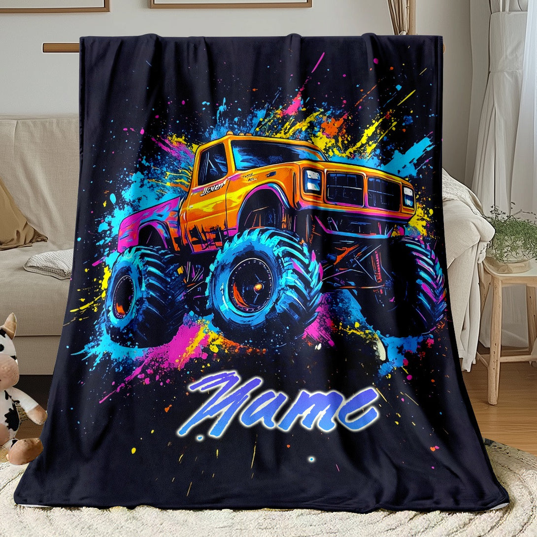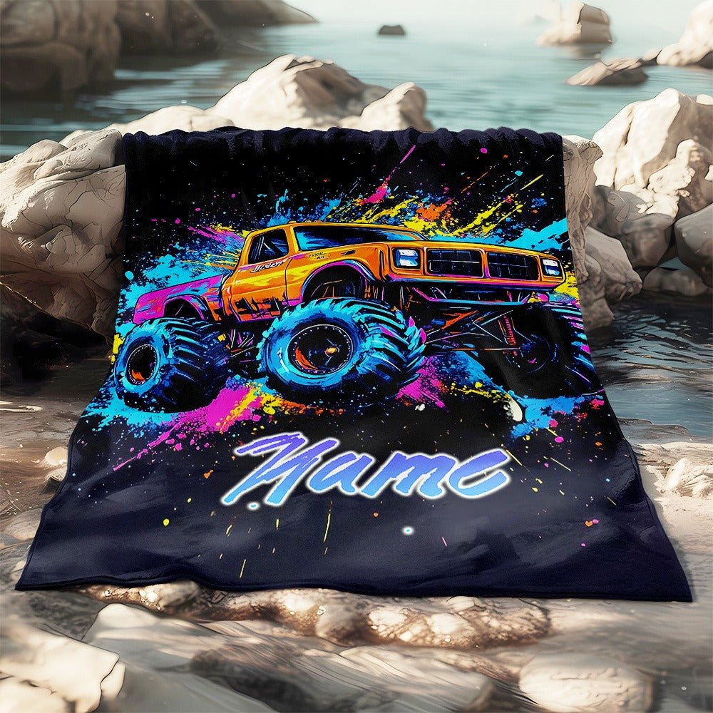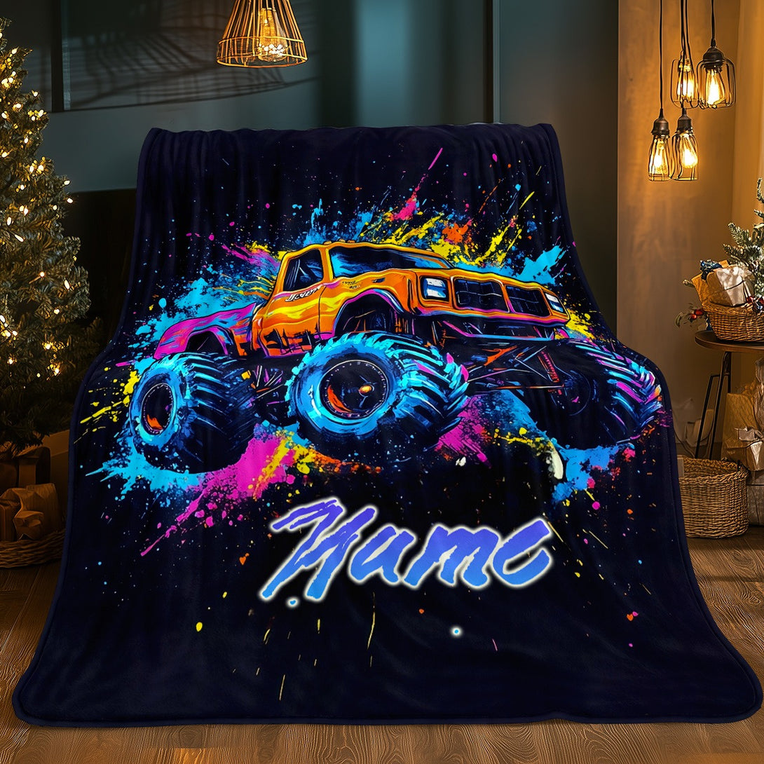 Personalized Monster Truck Flannel Blanket – Custom Name Ink Splitter Design