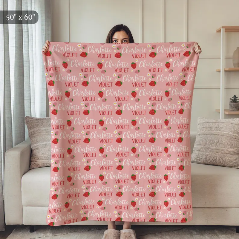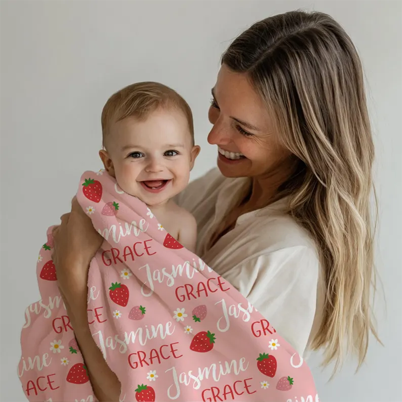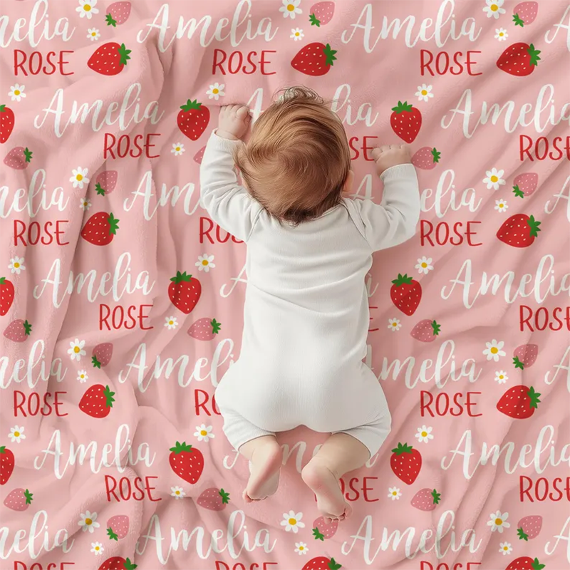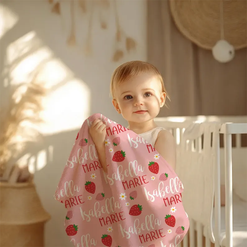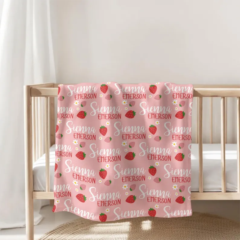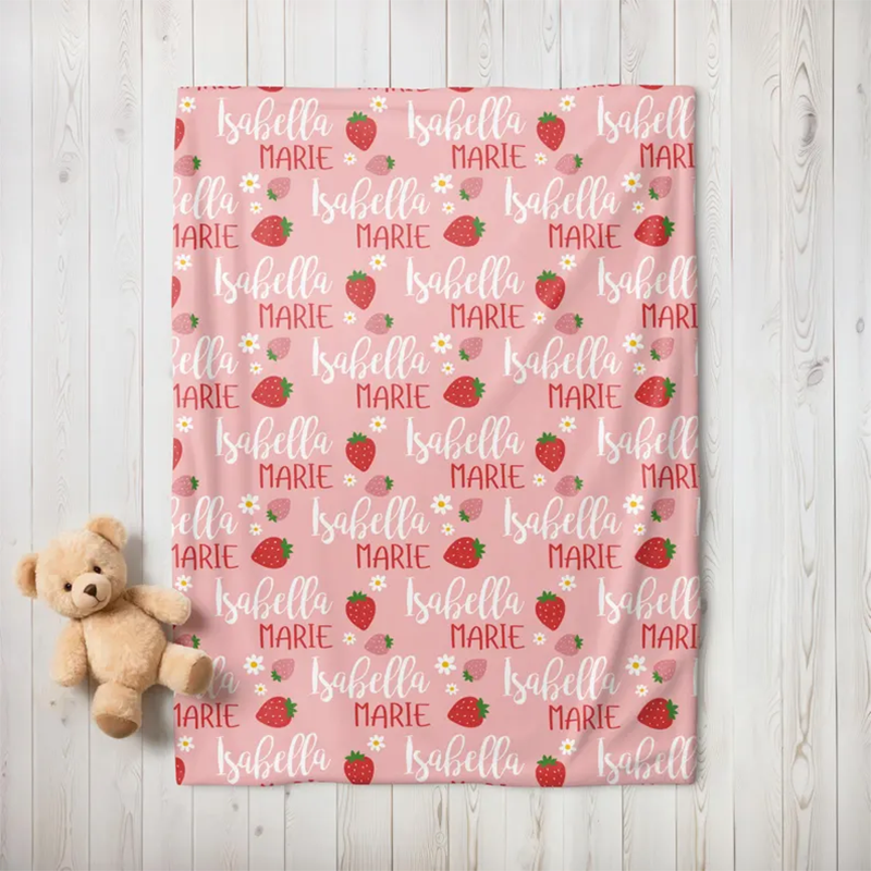 Personalized Strawberry Blanket, Custom Baby Name Blanket