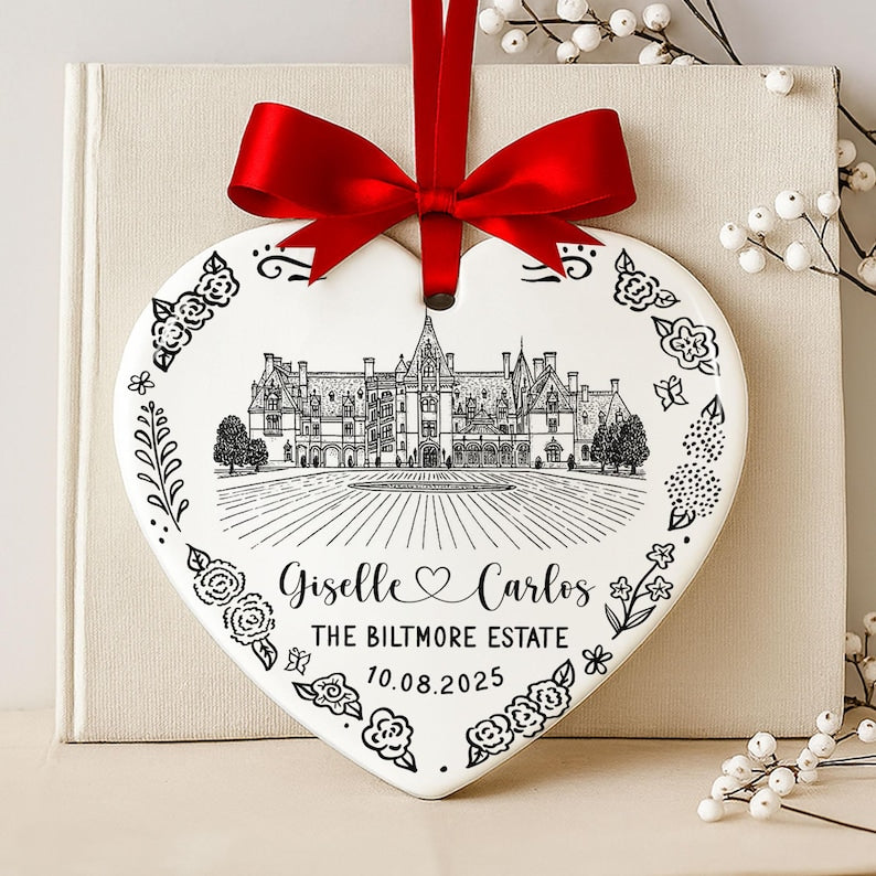 Celebrate love and memories with a personalized ceramic ornament featuring your wedding venue—perfect for newlyweds, couples, and housewarming gifts.