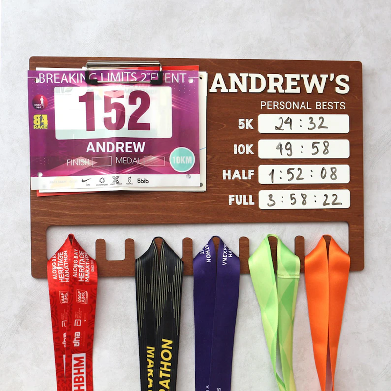 Showcase your running achievements with our custom medal, bib, and personal bests board! Featuring a sleek whiteboard design with built-in medal hangers, it's perfect for tracking your 5K, 10K, Half, and Full marathon times (marker not included).