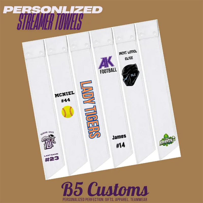 A sports streamer towel personalized for players is a thoughtful and practical choice for any occasion. Whether it's a QB towel, custom streamer for team gift ideas, or a high school sports team towel for travel ball, it’s perfect for showing team pride! These designs can be full color.