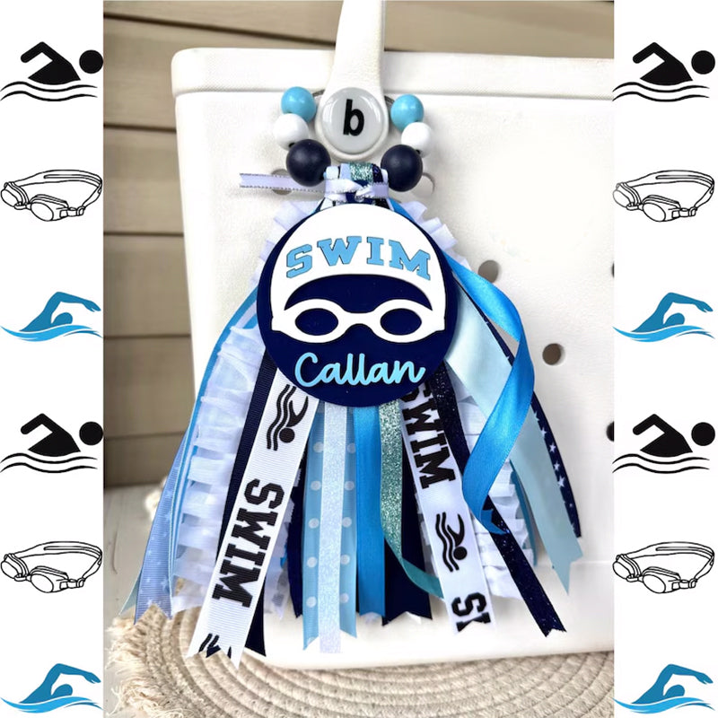 Make a splash with our custom Swim Tassel Charm—the perfect accessory for any swimmer, swim parent, or coach! 🏊♀️✨ Designed to add a pop of personality to swim bags, backpacks, or keychains, this tassel features your choice of four vibrant ribbon colors, four colorful beads, and a waterproof acrylic charm customized with a name. Each charm is secured with a twist-lock wire to keep it in place no matter how many laps you swim!