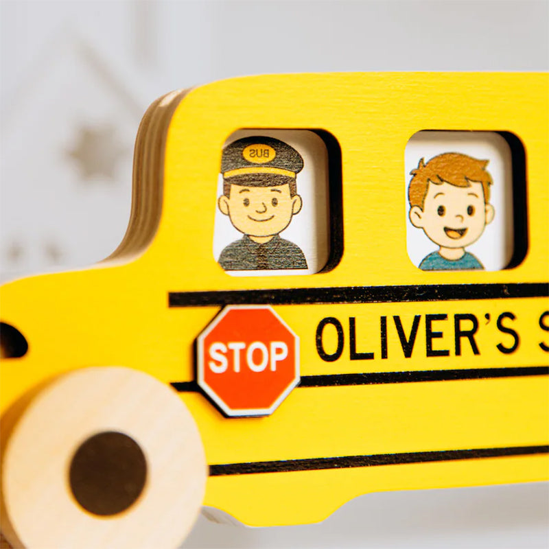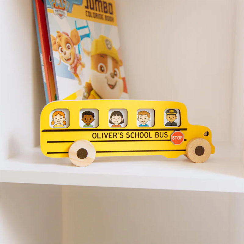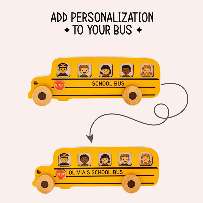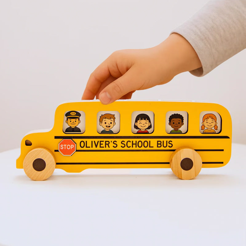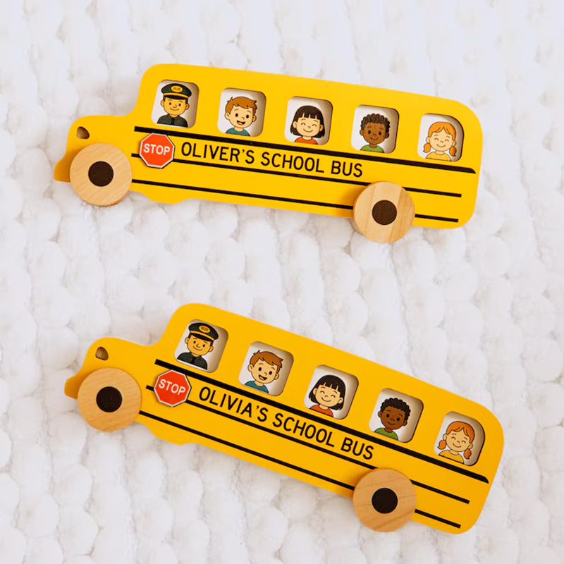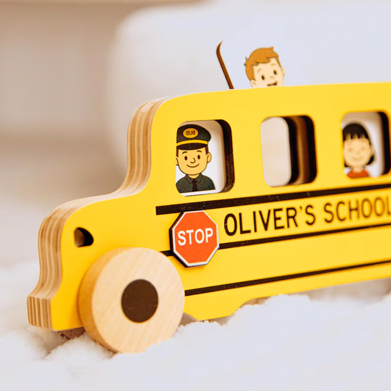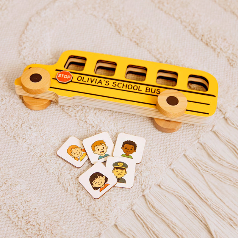 All aboard the fun! This personalized wooden school bus lets little ones place passenger cards inside, boosting imagination and fine motor skills. A perfect gift for toddlers for any occasion — and a special keepsake for the first day of school.