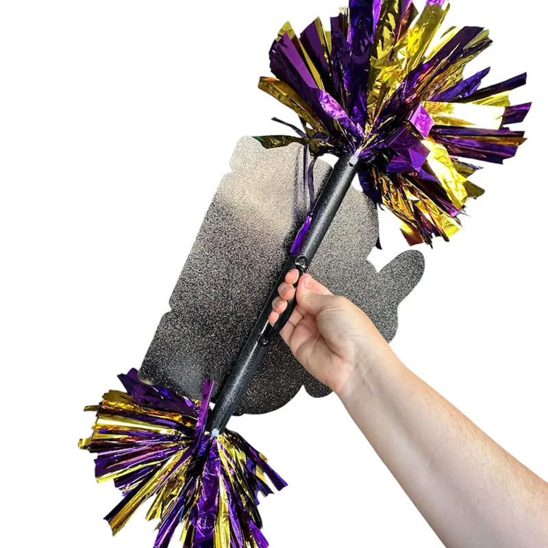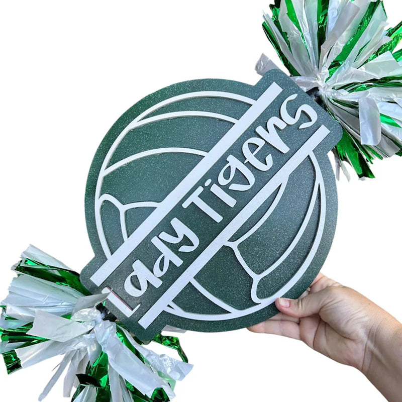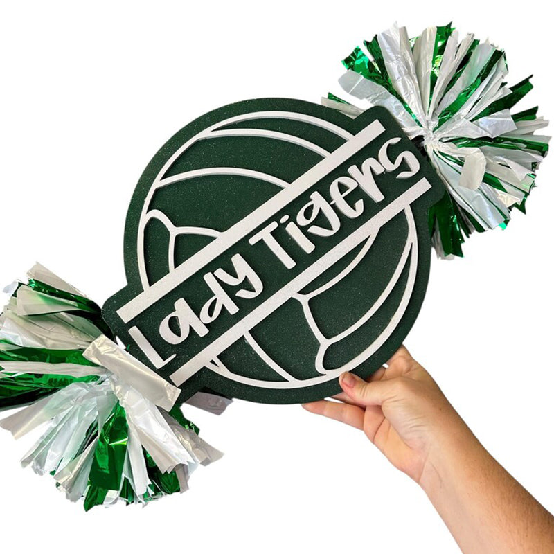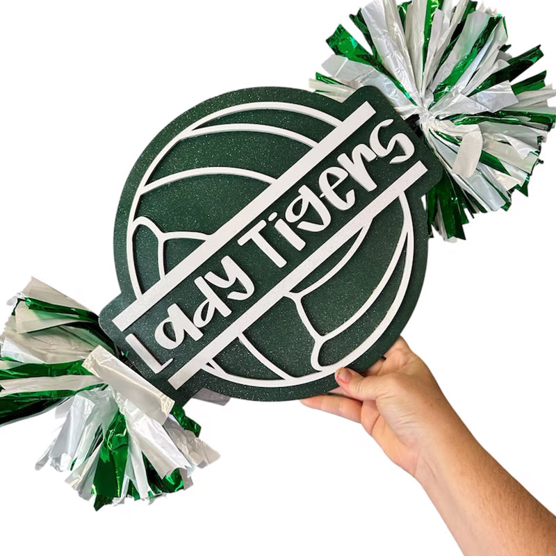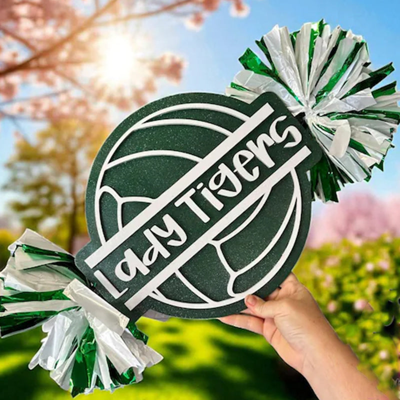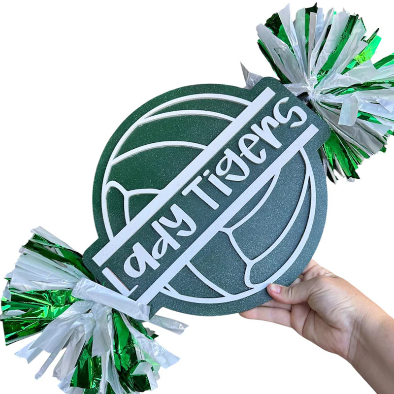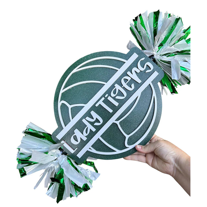 Bring the energy of the court straight to the stands with this volleyball cheerstick! Handmade from sturdy wood and painted in bold team colors, this spirited sign is topped with shiny pom-poms that shimmer with every move.