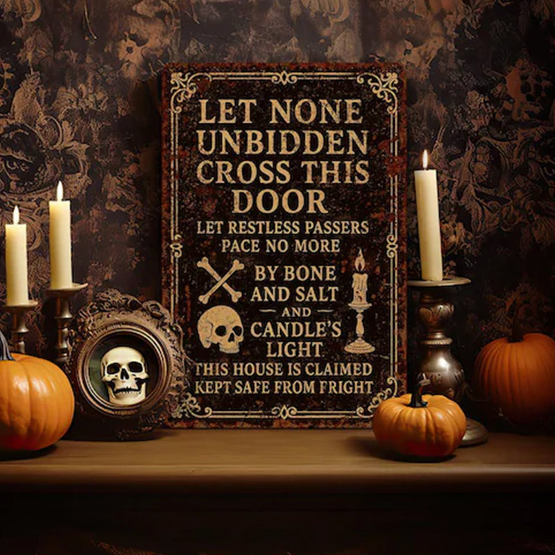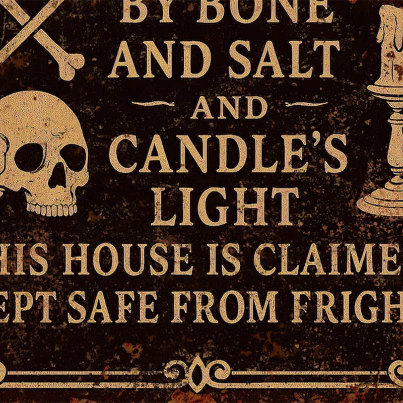 Etched with a poetic incantation and adorned with gothic details—bone, skull, candle, and salt—this piece brings the ancient art of house magic to your Halloween decor. Designed to look like a weathered spell page or protective plaque, it evokes the feeling of an old-world charm.